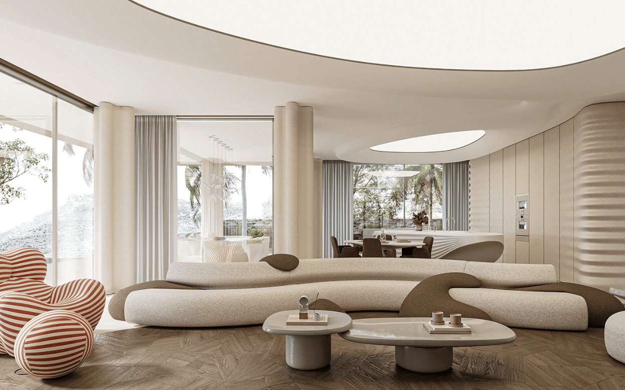 佩拉住宅的建筑设计实践体现在其连贯的设计语言上。建筑外部的纤维混凝土构成的流动曲线与柔和过渡,暗示着一种被捕捉的运动感。白色表面不仅增强了建筑的轻盈感,也与海岸环境形成呼应。在内部空间,建筑师延续了外部的动态理念,通过参数化几何与材料的连续性进行表达。墙面采用米色纤维混凝土,并以微妙的流动线条塑造,使建筑结构本身成为主导的空间元素。