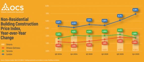 根据安大略省建筑秘书处(OCS)发布的最新经济数据,2025年第四季度安大略省非住宅建筑价格延续上涨态势。建筑价格指数显示,该季度非住宅建筑价格同比上升4.5%,环比增长0.7%。工业建筑和工厂项目是价格上涨的主要因素,而劳动力和材料成本持续处于高位。