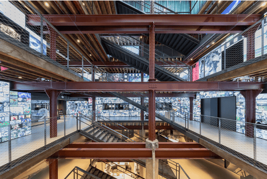 地面层的改造将封闭的百叶窗替换为玻璃幕墙,使城市景观融入室内,过往的行人与车辆可一览内部空间。博物馆中央设计了一个高大的中庭,楼梯从地下室延伸至顶层,日光透过上方洒在裸露的铸铁柱和木梁上。管线设施巧妙隐藏于托梁之间,保持了天花板的简洁。楼梯引导访客经过画廊、开放储藏库及玻璃幕墙后的保护修复工坊,游客可近距离观看专家处理底片和照片,体验摄影作为实体与图像的双重角色。