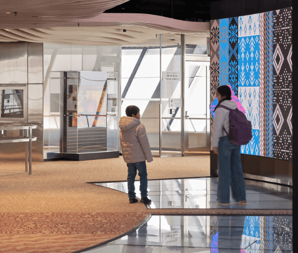 新安装的40英尺长沉浸式视频墙和全景屏幕,配合全息声及卫星扬声器,确保在近10,000平方英尺空间内声音均匀分布。视频内容展示加拿大及原住民艺术家的原创作品。