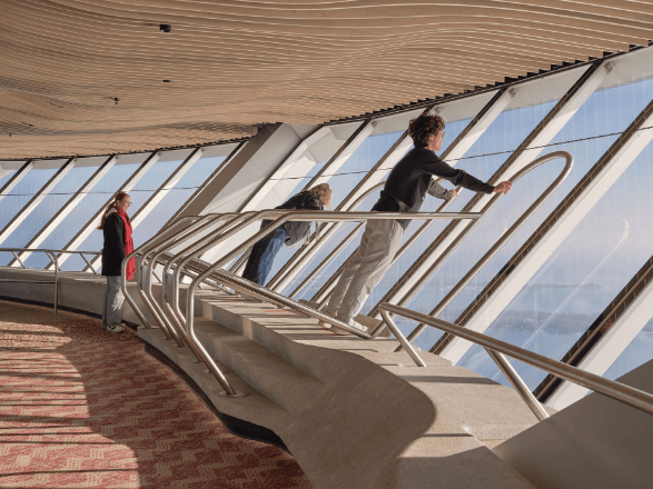 翻新工程包括更换外围围护系统和玻璃地板为全新结构玻璃,并新增两个“倾斜区”,让游客能倚靠观赏城市全景。天花板系统采用参数化设计,借鉴原始建筑风格,以数字制造的橡木层压鳍片排列。