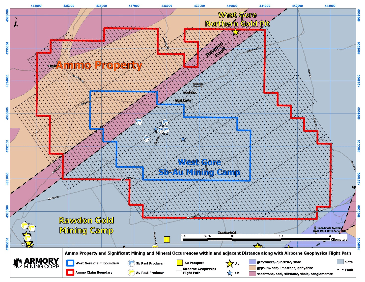 Ammo项目覆盖约3,020公顷,包括历史悠久的West Gore锑金矿区。该区域地质以Meguma群的Halifax组绢云母板岩为主,岩浆活动可能促成了金矿化。矿化多呈脉状,与石英-碳酸盐脉及多种硫化物相关,曾有大型金块发现记录。
