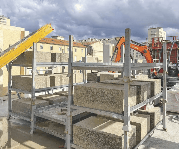 这些土块由专门从事挖掘土增值利用的公司Filiater预制,并由立面工程承包商GT Construction安装,随后涂上石灰砂浆以融入街区。由于现场土量有限,Filiater从另一马赛工地取土,通过10次半挂车运输收集并转化了260吨土壤,生产1000块土块用于前三层。原计划转化400吨,但因机器调试困难,GT Construction提议改用加尔省SOC采石场的大型石块,保持相同施工方法。经过一个月研究并获得批准,决定在12月初确认,到1月底最后三层基本完工。
