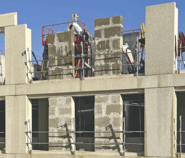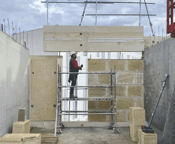 Redman的项目总监Yannick Baujeu表示:“由于混凝土墙体覆盖在土块上方,结构进度取决于填充构件安装节奏。我们能在施工阶段迅速调整,用石块替代土块。采石场快速生产了剩余500块,多亏团队努力,我们遵守了时间表和环保承诺。”因此,主体工程公司Ovatis将按约定在2月中旬完成工程。Jérôme Apack强调:“这一变化凸显了项目的韧性以及柱梁结构的适应性,如果土壤是承重的,这就不可能实现。”项目面积6200平方米,工程金额1480万欧元不含税,涉及多家企业如GT Construction和Ovatis。