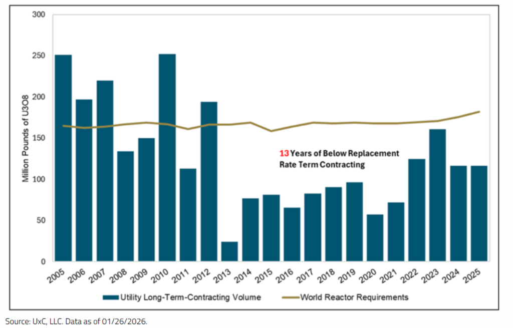 铀合同签订长期滞后,进一步推高了价格和市场动能。公用事业公司通常提前数年采购核燃料,但2025年合同签订连续第13年低于替代率,将未满足需求延后。这种延迟采购增加了未来市场压力,公用事业公司可能被迫以更大数量重返市场,面临选择减少和价格上升的风险。斯普洛特认为,2026年决策对2030年代初期的供应至关重要,合同签订在2025年底已显现回升迹象。怀特总结道,铀市场以建设性格局进入2026年,“1月份提前提醒了铀在基本面收紧和情绪转变时的非线性行为。”总体来看,铀市场在政策支持、供应紧张和需求增长的共同作用下,正积聚显著动能。