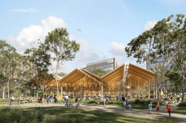 效果图显示,这一市民中心将分布约20栋中层建筑,融入绿地环境中。一个由木材建造的低矮斜顶展馆将提供餐饮和其他服务,其顶篷采用互锁木材编织设计,旨在体现原住民的“适度”原则。研究人员Rebecca Clements和Tooran Alizadeh指出,该规划位于未割让的原住民土地上,靠近澳大利亚最大的城市原住民社区。