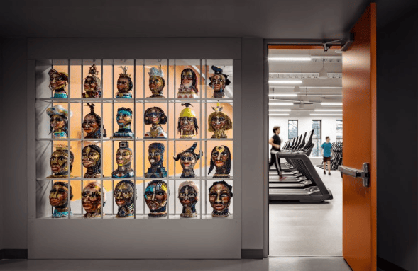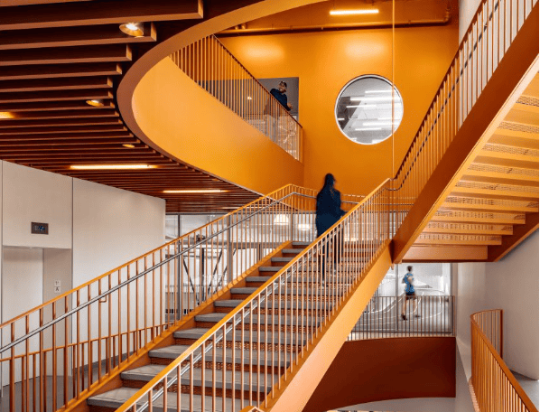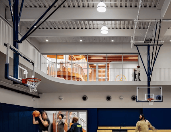 内部空间两侧设有双层高体育馆和游泳池,较小房间如办公室、更衣室、舞蹈室及健身区蜿蜒分布其间,延伸至上层。切口、观景平台和内部窗户确保视线贯通。大厅配置亮橙色大楼梯,其他元素包括游泳池上方胶合木梁、定制木制品及艺术家Vanessa German的半身像系列。