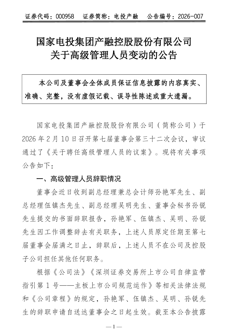 2026年2月11日, 中国电投产融发布公告称,公司2月10日召开第七届董事会第三十二次会议,审议通过了《关于聘任高级管理人员的议案》。