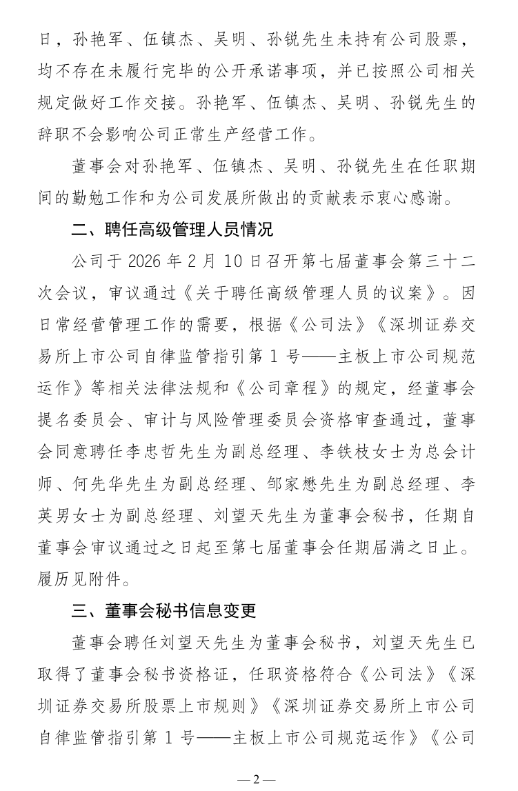 董事会近日收到副总经理兼总会计师孙艳军先生、副总经理伍镇杰先生、副总经理吴明先生、董事会秘书孙锐先生提交的书面辞职报告,孙艳军、伍镇杰、吴明、孙锐先生因工作调整辞去有关职务,上述人员原定任期至第七届董事会届满之日止,辞职后,上述人员不在公司及控股子公司担任其他任何职务。