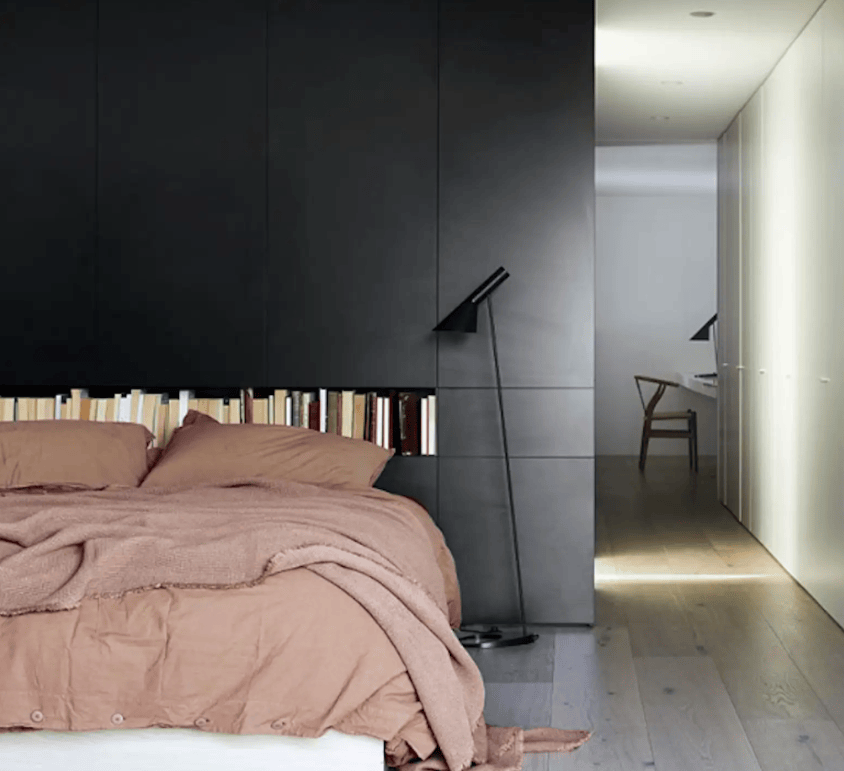 这种床头板设计不仅适用于小空间,在宽敞卧室或大尺寸套房中,也越来越多地被用作个性化表达。一面铺满书籍、木材或定制模块的墙壁,可以成为空间焦点,展现居住者的品味。