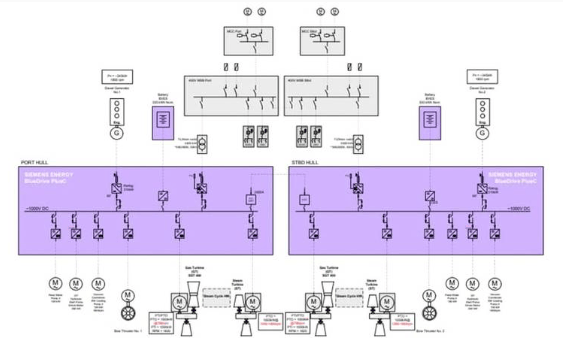 发动机舱基于2022年推出的海洋绿色混合联合循环概念,每个船体配备SGT-400联合循环电厂,保证功率13兆瓦。燃气轮机废热通过一次通过蒸汽发生器回收,驱动蒸汽轮机,整体轴功率达36.4兆瓦。系统还包括电池储能和岸电连接,确保可靠运行。