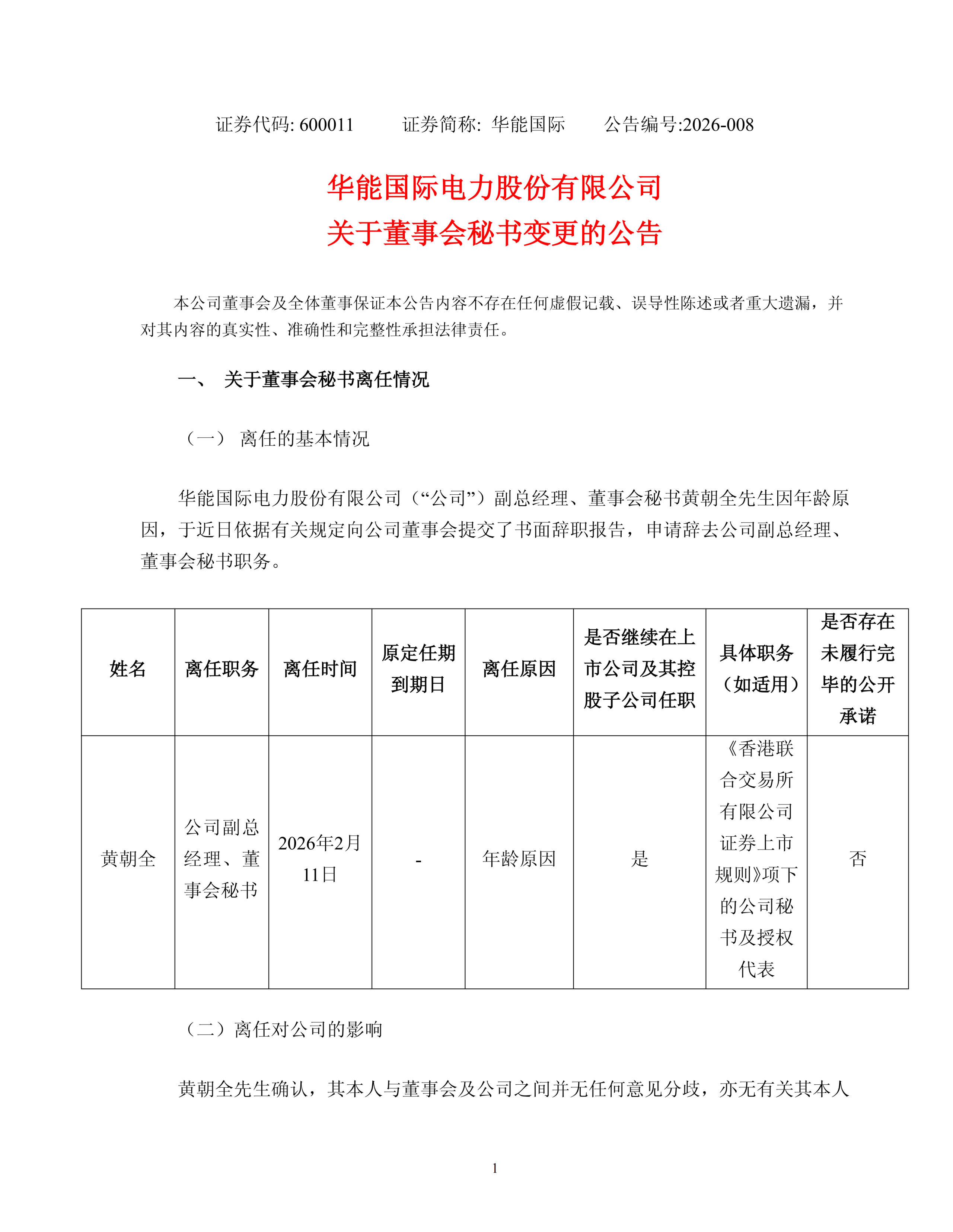 此外,华能国际副总经理、董事会秘书黄朝全先生因年龄原因,于近日依据有关规定向公司董事会提交了书面辞职报告,申请辞去公司副总经理、董事会秘书职务。