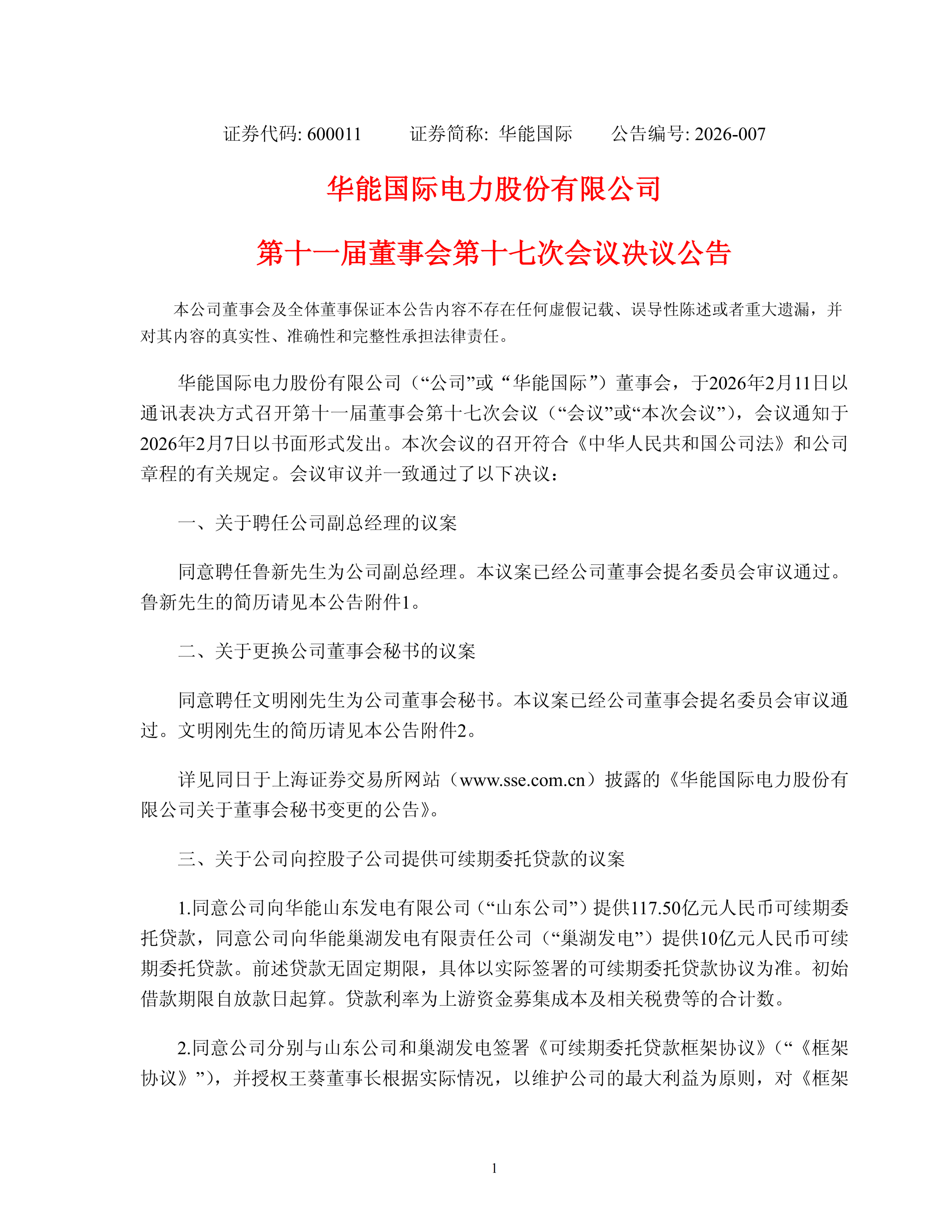 2月11日,华能国际召开董事会,同意聘任鲁新先生为公司副总经理。本议案已经公司董事会提名委员会审议通过。