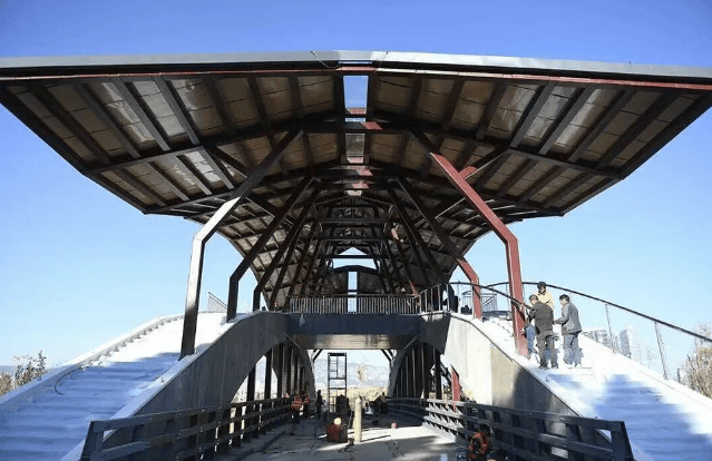 据设计团队介绍,这座道路桥梁灵感源自元代文人王升《滇池赋》中“一桥横贯日之虹”的诗句,旨在将古典文学意境转化为当代城市景观。桥体结构呈现“下刚上柔”特征:桥基部分融合传统石拱桥形态与现代钢结构,上部人行拱桥采用叠顶廊桥的轻盈形态,形成层叠起伏的视觉轮廓。该道路桥梁在实现交通功能的同时,也成为滇池绿道沿线可停留、可观赏的景观节点。