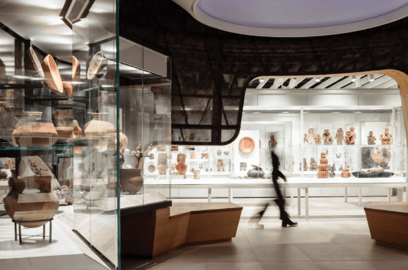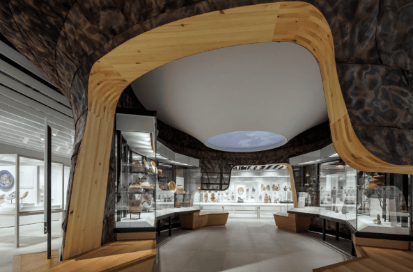 藏品画廊被改造为开放式单一房间,新展示柜用于划分展品并优化人流。材料选用白橡木、天然石材和耐用层压板,营造温暖氛围。陶瓷作品照明充足,间距合理,提升了观赏体验。