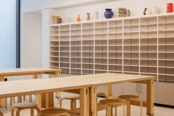 翻新工程的关键举措是增设一道连续的玻璃带状墙,从主入口延伸至藏品画廊。这面墙兼具导视与展示功能,其蜿蜒的路径引导访客流畅移动,呼应陶瓷艺术的质感。在展示间隙,玻璃墙连接了相邻空间,如升级通风的创客空间和适应学校团体需求的社区学习中心。