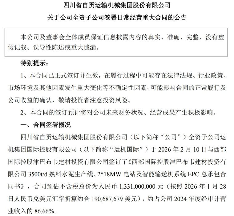 2月10日晚间,运机集团(SZ001288)公告称,其全资子公司运机国际与西部国际控股津巴布韦建材投资有限公司签署EPC总承包合同,将承建一条3500t/d熟料水泥生产线、2×18MW电站及智能输送机系统。合同预估不含税总价为13.31亿元人民币,约占运机集团2024年度经审计营业收入的86.66%。