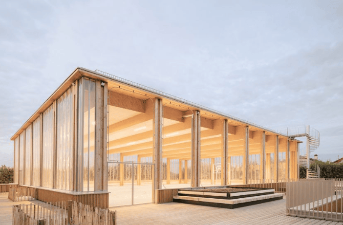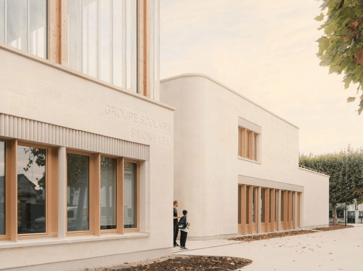 法国巴黎郊区特伦布莱昂法兰西的 Simone Veil 学校群,由当地工作室 Le Penhuel & Associés 设计,占地 2,400 平方米,包含八间教室、食堂和行政区域,以及一个与社区共享的屋顶运动场。这座学校以承重石木结构为特色,体现了教育建筑在可持续建筑方法上的责任。
