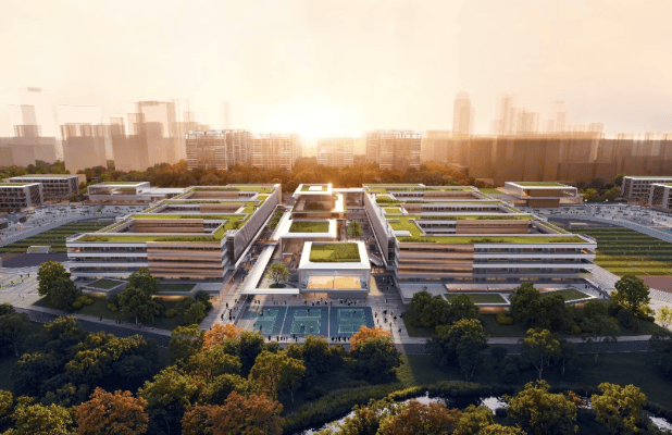 该项目位于杭州市西湖区,总建筑面积约16.2万平方米。根据学校建设规划,校园将建设9栋教学功能建筑,涵盖行政楼、教学楼、实验楼及专业教室;8栋生活功能建筑,包括学生和教师宿舍、食堂;以及2栋共享功能空间,内含风雨操场、报告厅与图书馆。设计方介绍,该学校建设项目以“文枢学环”为核心理念,旨在构建一个集文化共生与未来教育场景于一体的复合空间。学校建设在功能布局上注重教学区的独立性与高效性,同时通过底层架空、退台设计等手法,增加活动空间与建筑的通透感。