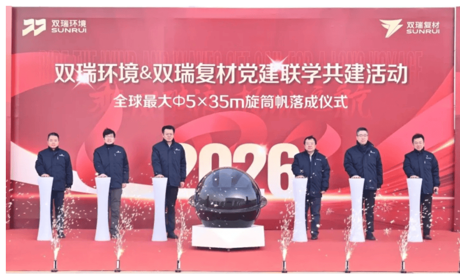 润瑞复合材料在复合材料和大结构件制造方面发挥专长,突破了超大圆筒成型和轻量化结构设计等关键技术,形成了从基础部件开发到整机组装测试的一体化能力。自2025年项目启动以来,两个团队整合了各自在风电和海洋环保设备领域的技术专长,协同推进大型转子帆的开发。在大连试验场,两家公司的六位领导共同为转子帆剪彩,见证了其正式亮相。随后,润瑞环境总经理余江水与润瑞复合材料总经理石俊虎启动了测试设备,开启下一阶段的陆上测试,以验证产品的长期可靠性、运行稳定性和环境适应性。