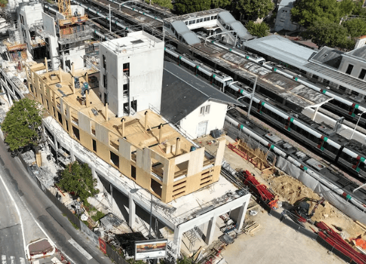 木结构安装在此基础上进行。WOA工作室建筑师Léo Pommereul表示:“为了限制来自铁路的振动传递,我们将其安装在多个弹簧箱上。”CLT墙体和楼板以及胶合木柱和梁仅用两个月时间,从2025年9月起通过起重机组装完成。施工利用伸缩缝分为两部分,先组装南部木结构以便快速移交次要工程,随后组装北部。目前工人正完成封闭和屋顶,并进行次要工程。