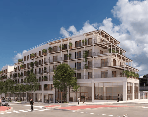建筑设有实木搁栅和铺板阳台,屋顶将绿化。Cogedim施工负责人Pierre Mere解释:“由于木结构涉及更厚的楼板复合层,我们获得了豁免。气候与韧性法允许这种必要调整,以达到目标的环境性能标准。”