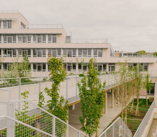学校占地5180平方米,共五层,位于前工业用地。规划有25间教室,顶层设俱乐部房间和食堂,可俯瞰巴黎全景。为最大化利用户外空间,Tectoniques采用“垂直学校”模式,以高而窄的U形平面布局环抱中央绿色庭院。