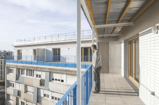 屋顶改造采用了简约风格,在拆除含有石棉的预制金属板外墙后,仅保留柱板结构。吉洛解释说:“我们进行了局部干预,以重新设计一个连贯的体积。”通过填补凹口和缺口,额外增加了约一百平方米的面积。新外墙使用白色釉面砖,搭配蓝色栏杆和浅蓝色窗框,无需加固地基。所有公寓设有面向南或东的开放式客厅露台,可俯瞰蒙特勒伊景色。现有柱网结构决定了房间布局,部分房间因此比标准更大。