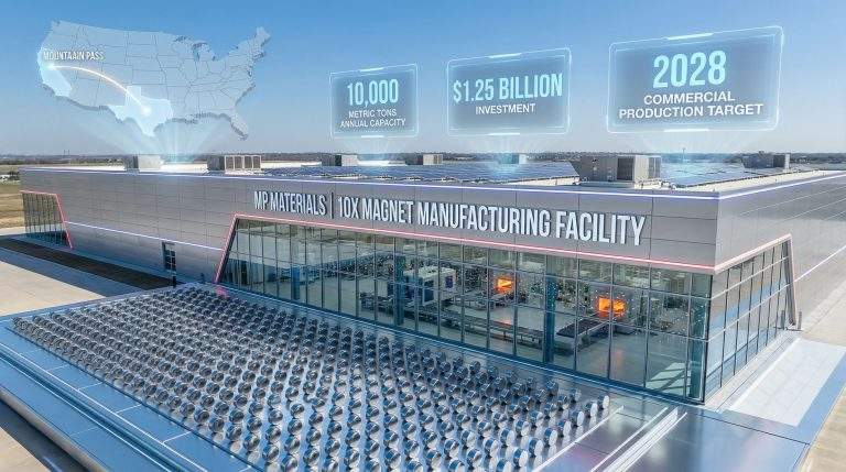 MP Materials宣布在德克萨斯州投资12.5亿美元,建设一座稀土磁体工厂,旨在增强供应链韧性并满足不断增长的市场需求。该项目位于Northlake园区,占地120英亩,设计年产能为10,000公吨钕铁硼磁体,主要应用于电动汽车、风能和国防领域。