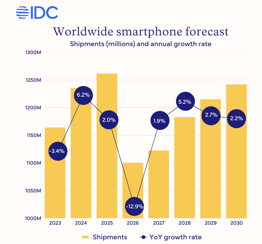 研究公司IDC预测,受内存芯片供应短缺影响,2026年智能手机出货量将同比下降12.9%,这可能是该行业有史以来最大的跌幅。内存危机主要由人工智能巨头为数据中心项目大量囤积库存导致,供应紧张局面持续恶化。