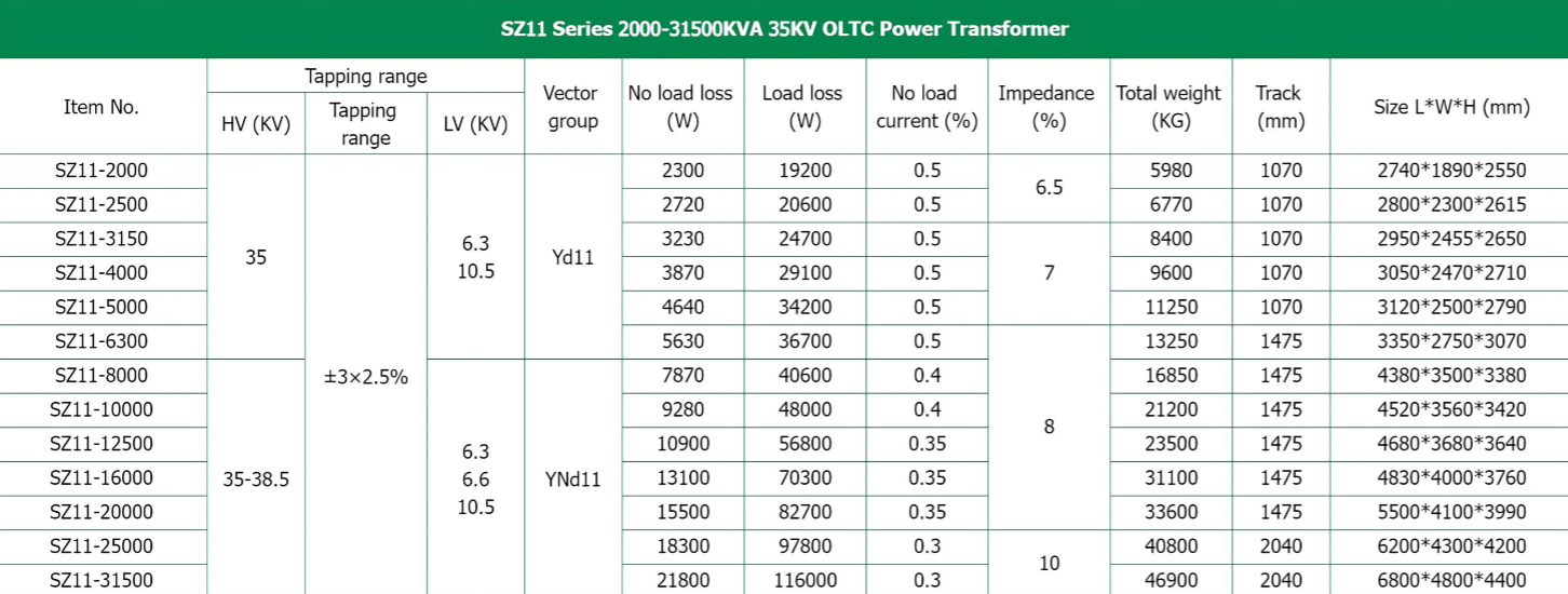 高灵活性: SZ11 系列变压器的额定功率范围从2000 KVA 到 31,500 KVA,可以满足各种配电需求,使其适用于从电力公司到大型制造厂等各个行业。