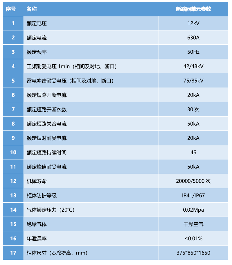 ·断路器机械寿命达 20000 次,接地关合能力达5次,整柜局放≤10PC,满足长期使用要求干燥空气稳定性高,无毒,适用于各种环境温度·气箱采用激光焊接技术,气体年泄露率≤0.01%。气箱充入 0.02Mpa的微正压空气绝缘,人员操作安全·开关采用复合绝缘形式,大幅提高了断路器的绝缘强度和耐久性。