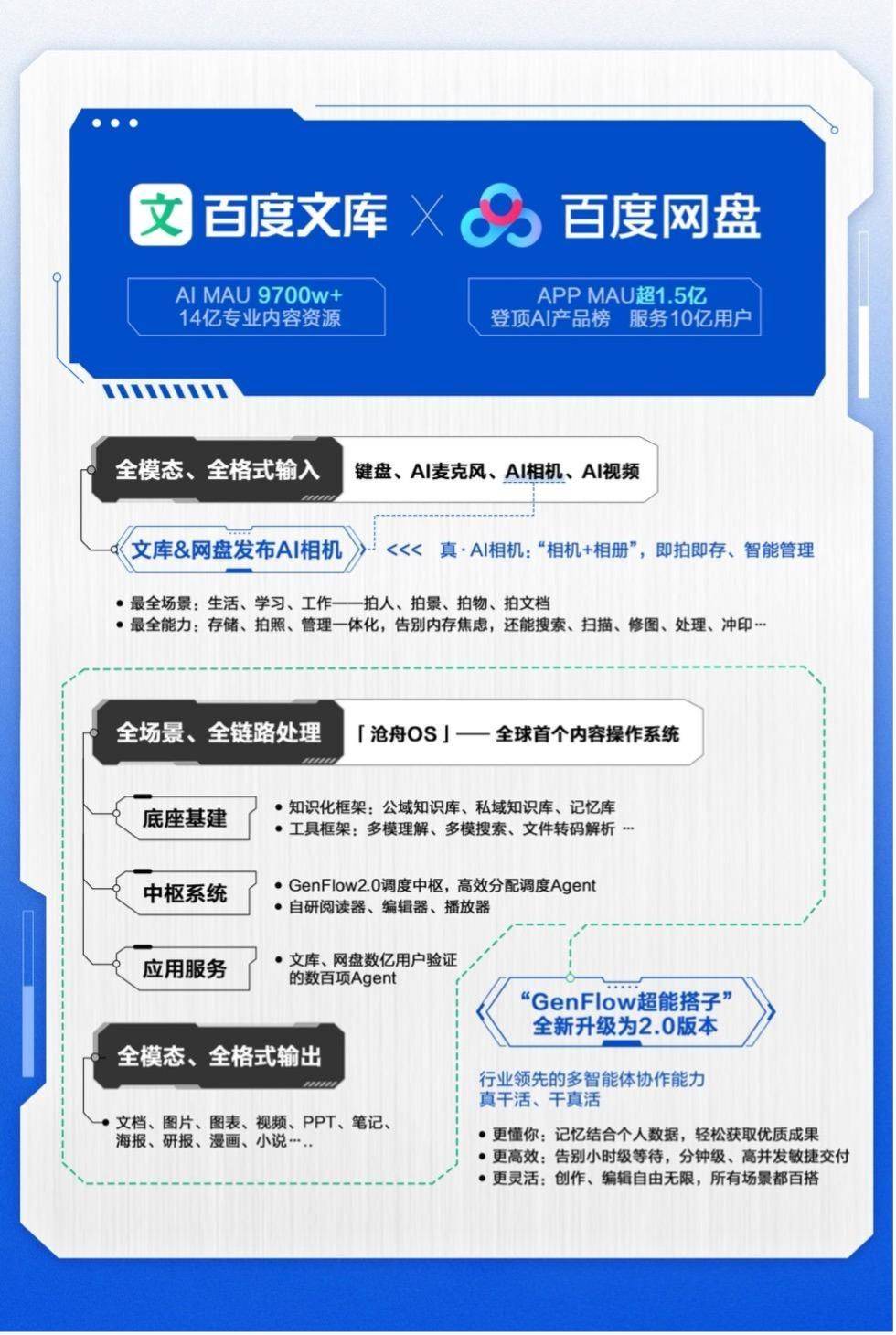 在全模态、系统化完整交付能力上,在输入端,百度文库、网盘拥有文字、语音、图片、视频等全模态、全格式输入能力,全天候、全方位接受并响应用户需求;在处理端,百度文库、百度网盘联合推出的内容操作系统沧舟OS,拥有对用户海量公私域内容、记忆库的全场景、全链路处理能力,通过中枢系统实现Agent之间的数据互通和智能调度;文库、网盘已被数亿用户验证的数百项Agent,可以灵活匹配各种任务需要,最终实现全模态、全格式内容的端到端输出。