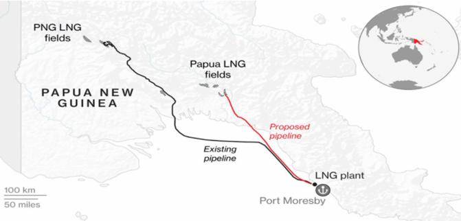 该项目预计总投入100亿美元,包括上游的九口生产井、注水井、二氧化碳回注井和天然气处理厂,以及下游的320公里长管道,将天然气输送至莫尔兹比港外的液化天然气厂进行加工装运,年出口液化天然气560万吨。巴布亚新几内亚的国家提名人有权选择持有项目高达22.5%的权益。