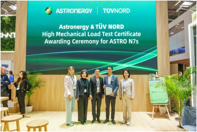 5月8日,Intersolar Europe展会上TÜV北德集团全球可再生能源执行副总裁Alexander Ohff向正泰新能ASTRO N7s组件授予+10000/-4000 Pa超高标准载荷测试证明,正泰新能全球产品技术服务总经理周盛永等共同见证。该测试通过模拟飓风、暴雪等极端环境下的长期机械应力,全面验证了ASTRO N7s在边框结构设计、封装工艺及材料耐候性方面的可靠性。