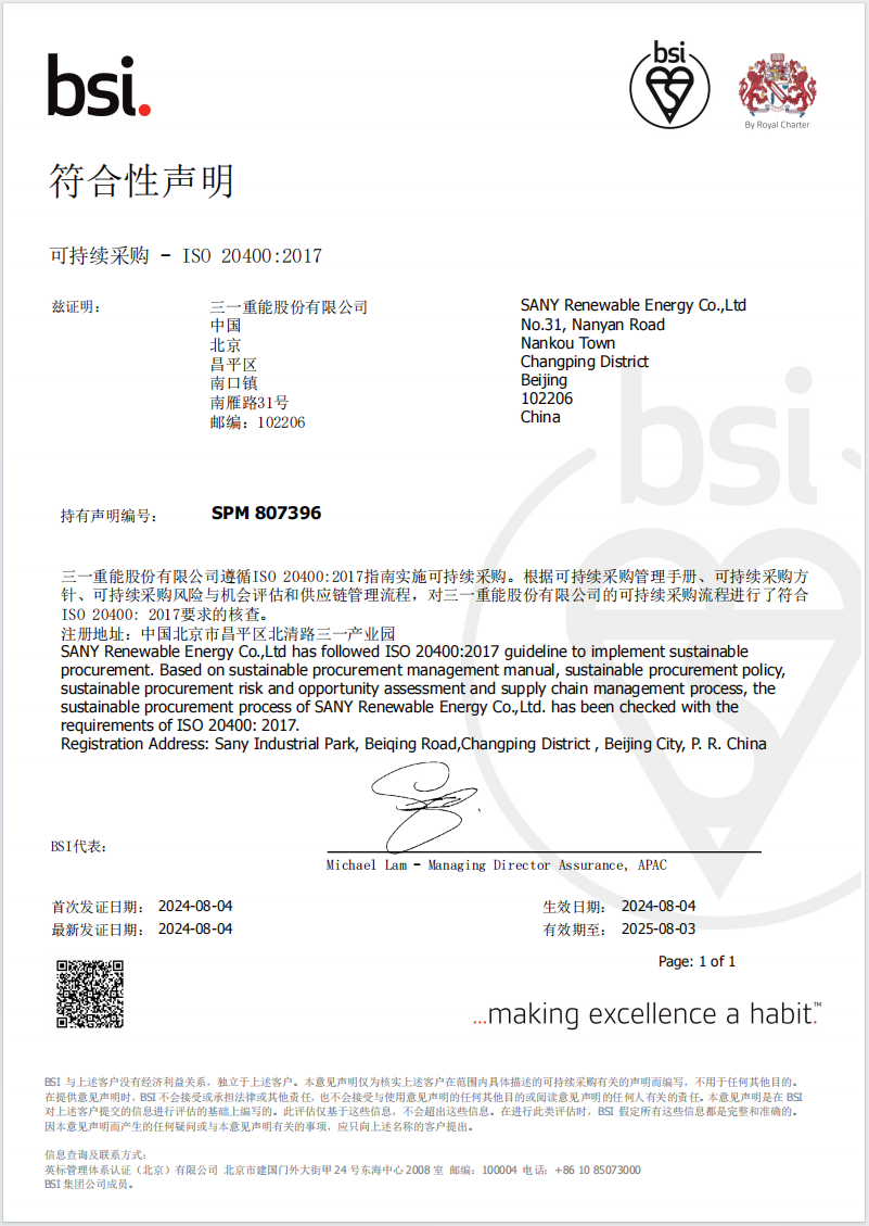 在企业治理方面,三一重能取得ISO37001反贿赂管理体系符合性声明,标志着公司治理水平再上新台阶。