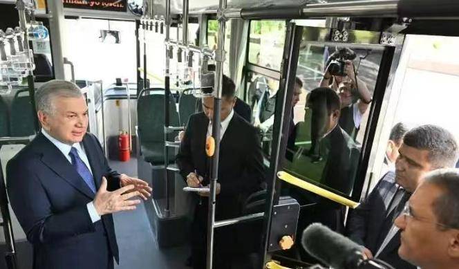 近日,乌兹别克斯坦总统沙夫卡特·米尔济约耶夫在花剌子模州首府乌尔根奇市考察期间,重点调研民众公共交通出行情况。在试乘山东重工中通N系公交客车后,点赞车辆对当地公共出行服务品质提升的卓越贡献。
