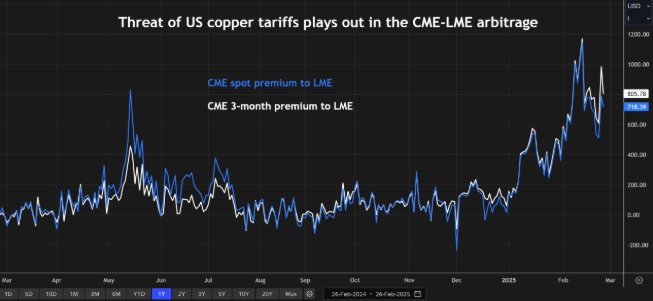 LME铜合约是一种国际产品,交货地点遍布三大洲,而CME铜合约仅限于美国国内交割点。这使得两者之间的套利成为交易美国进口关税潜力的理想工具。当特朗普首次将铜列为关税目标时,CME铜价相对于LME的溢价跃升至每吨1000美元以上。LME铜价略高于每吨9000美元,CME溢价意味着市场预期对进口铜征收10%的关税。
