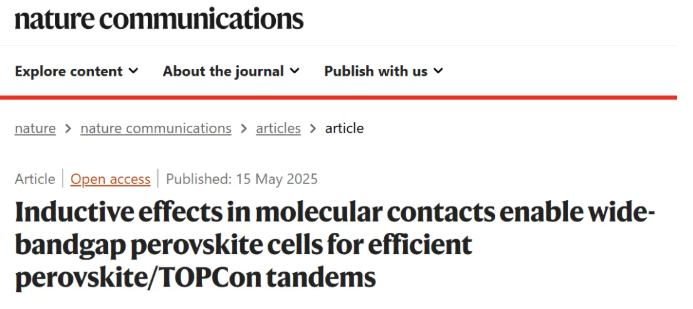 近日,捷泰科技携手浙江大学在钙钛矿叠层电池领域取得重要突破,相关研究成果以论文形式在国际权威期刊《Nature Communications》上正式发表。论文题目为《Inductive effects in molecular contacts enable wide-bandgap perovskite cells for efficient perovskite/TOPCon tandems》。
