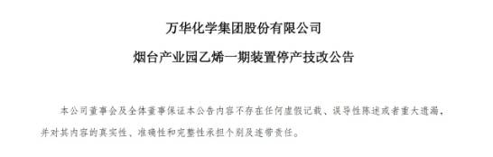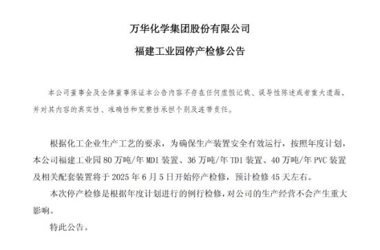 根据化工企业生产工艺的要求,为确保生产装置安全有效运行,按照年度计划,本公司福建工业园 80 万吨/年 MDI 装置、36 万吨/年 TDI 装置、40 万吨/年 PVC 装置及相关配套装置将于 2025年6月5日开始停产检修,预计检修 45 天左右。