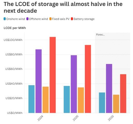 BNEF报告显示,固定轴太阳能的LCOE去年已大幅下降21%,并预测到2025年底将进一步降至35美元/兆瓦时,到2035年底更将降至25美元/兆瓦时。同时,使用跟踪器的光伏系统LCOE虽然略高,但仍是第三便宜的技术类型,仅次于固定轴光伏和陆上风电。值得注意的是,BNEF还预测到2025年,电池LCOE将由104美元/兆瓦时降至93美元/兆瓦时,首次跌破100美元/兆瓦时的门槛,这一降幅在其他清洁能源领域中显得尤为突出。