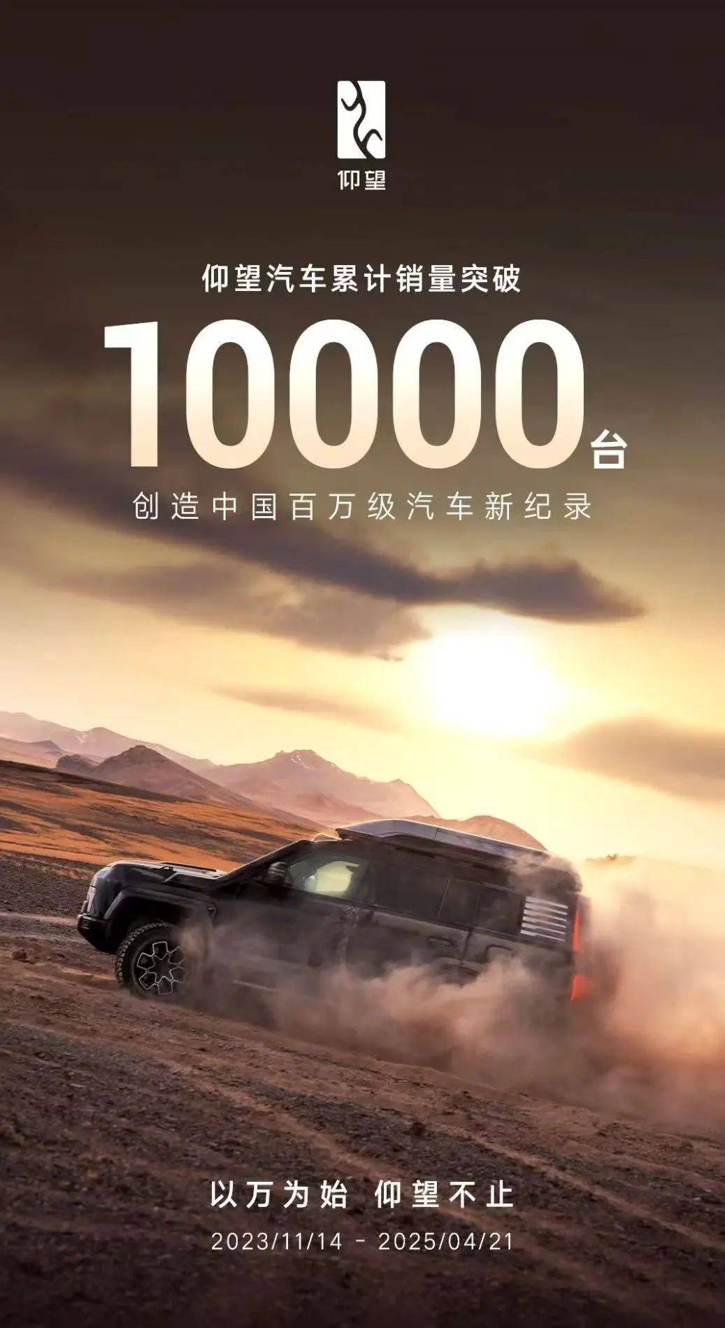 4月21日,仰望汽车宣布,其累计销量突破10000台,创造了中国百万级汽车新纪录。