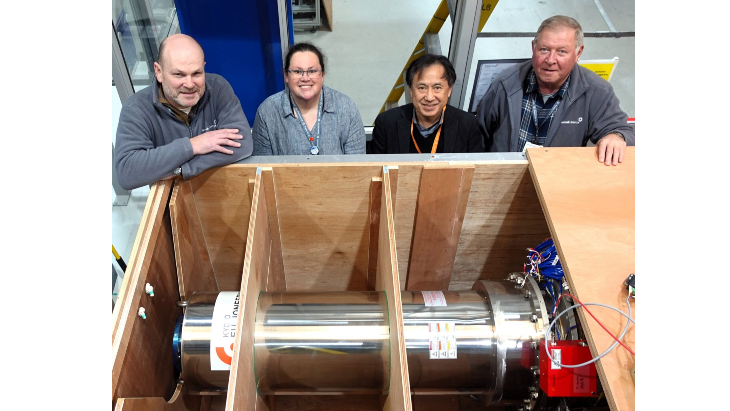 回旋加速器,左为 Morgan,左三为 Sakamoto,左二为加热和电流驱动团队负责人 Emma Wooldridge,左三为高级技术顾问 Vladimir Shevchenko(图片来源:Tokamak Energy)