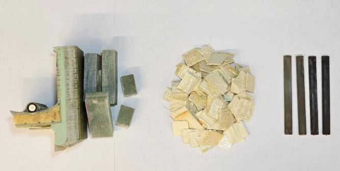 左:风机叶片废料中:经过烘干等步骤处理后的风机叶片废料右:分解后获得的注塑塑料
