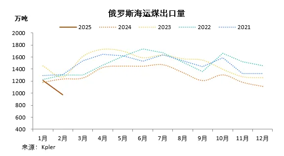 Kpler船舶追踪数据显示,2025年2月份,俄罗斯海运煤出口量970.57万吨,再破近几年新低,环比降19.71%,同比降21.57%。从2021年以来数据看,这是出口量最低的一个月,也是首次跌至1000万吨以下。