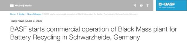 6月3日,巴斯夫宣布位于德国施瓦茨海德(Schwarzheide)的Black Mass工厂已成功投入商业运营。这座先进的设施代表着巴斯夫电池回收业务的重要里程碑。它是欧洲最大的Black Mass商业工厂之一,年处理能力高达1.5万吨报废锂离子电池和生产废料,相当于每年约4万块电动汽车电池。